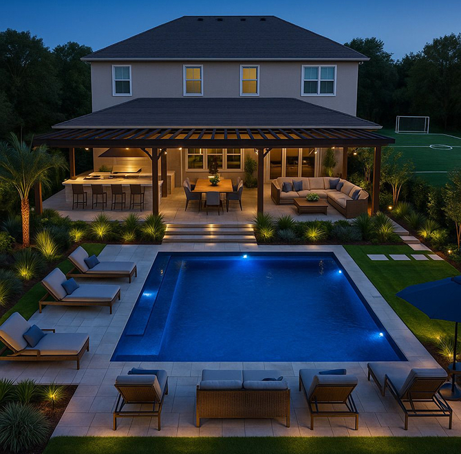 We go beyond the pool: From pergolas and summer kitchens to furniture and lighting, we provide every element to create a single, cohesive backyard oasis.